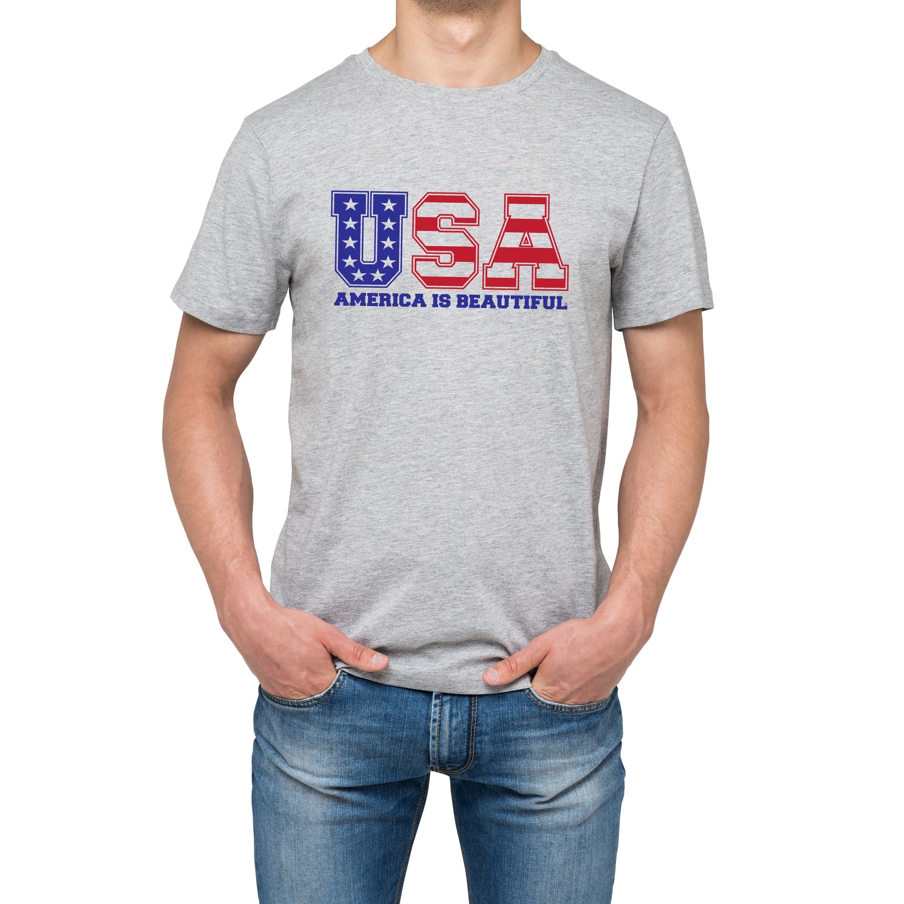 USA! USA! USA! Your USA message text is filled with the American flag’s red white and blue stars and stripes, and is underscored with the most perfect slogan America Is Beautiful. Very cool. You’ll feel proud to spread the central virtues our American flag represents - freedom, family, liberty, and the pursuit of happiness. Love of country and positive patriotism all in one cool red, white and blue cool design! Love that red, white and blue! Is this a great country or what!